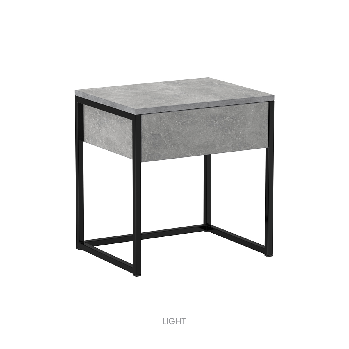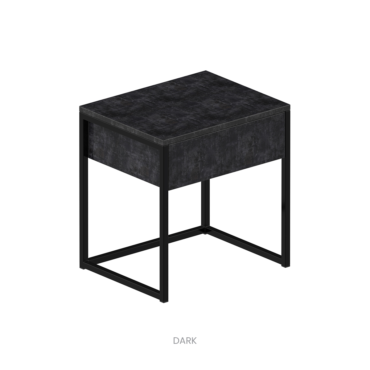 Ta wersja pozwala na łatwe łączenie z różnymi łóżkami tapicerowanymi i drewnianymi i nadaje się do nowoczesnych sypialni. Metalowa konstrukcja w połączeniu z dekorem betonu (Dark / Light) nadaje jej industrialny, a jednocześnie ponadczasowy charakter. W ramach kolekcji tworzy harmonijną całość i pozwala na elastyczną aranżację w zależności od potrzeb przestrzeni.