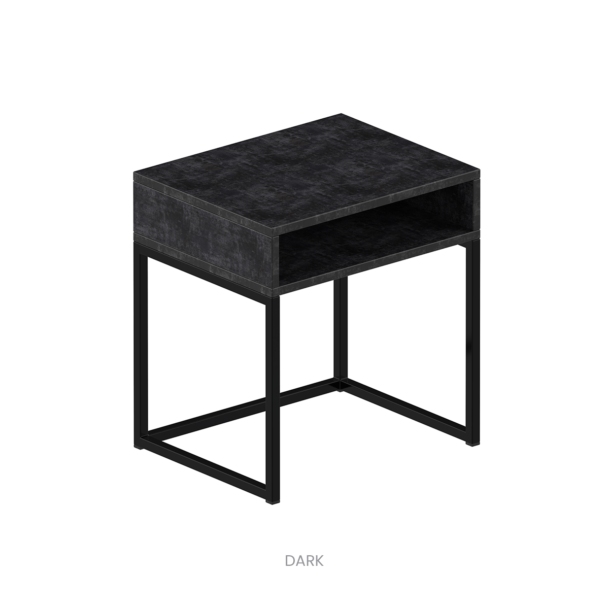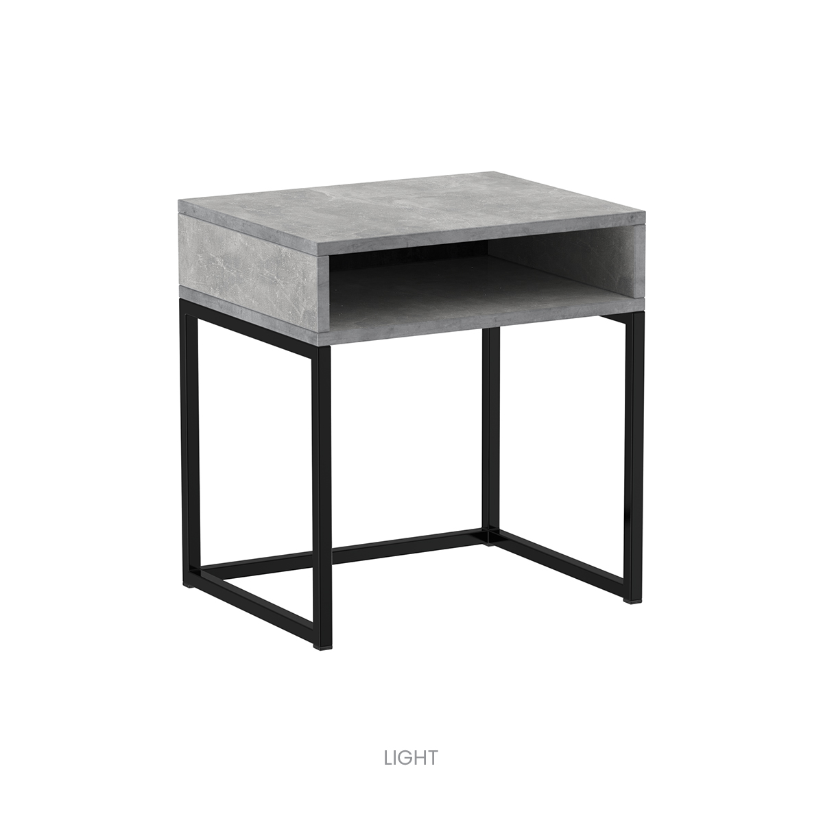 Stolik VITO łączy w sobie czyste linie z praktycznością otwartej przestrzeni do przechowywania. Metalowa konstrukcja w czarnym wykończeniu w połączeniu z blatem w dekorze betonu (Dark / Light) nadaje wnętrzu nowoczesny, industrialny charakter.